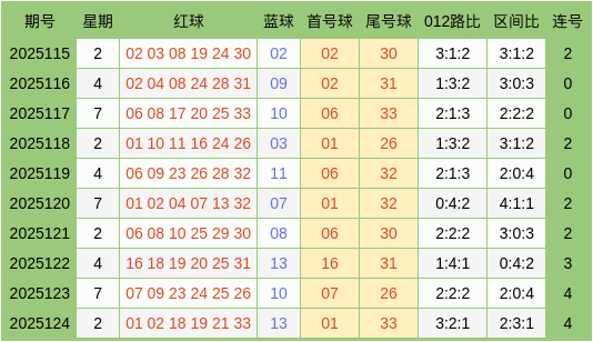 上期回顾:双色球2025124期开出奖号:红球01、02、18、19、21、33,蓝球13。