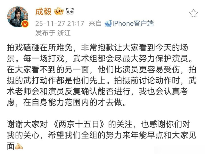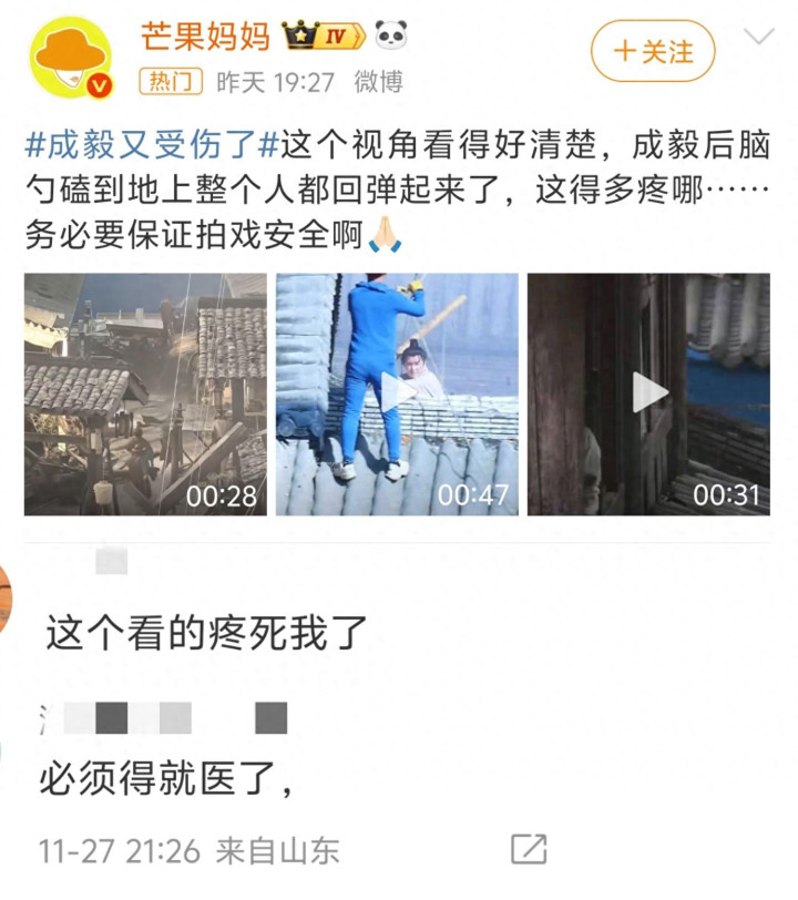 成毅本人则回应说没事,拍武打戏受伤是在所难免的,武术组受伤的频率比演员更高,为了保护演员,设计的动作都是他们先试一遍。这些动作都是他考虑过后确定可以才拍的。