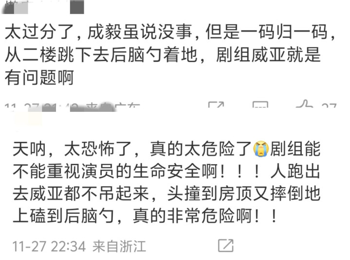 后脑勺着地后可以看到成毅本人是非常痛苦的,一直在抱头打滚,身体蜷缩。现场工作人员也被吓到了,跑去查看情况。