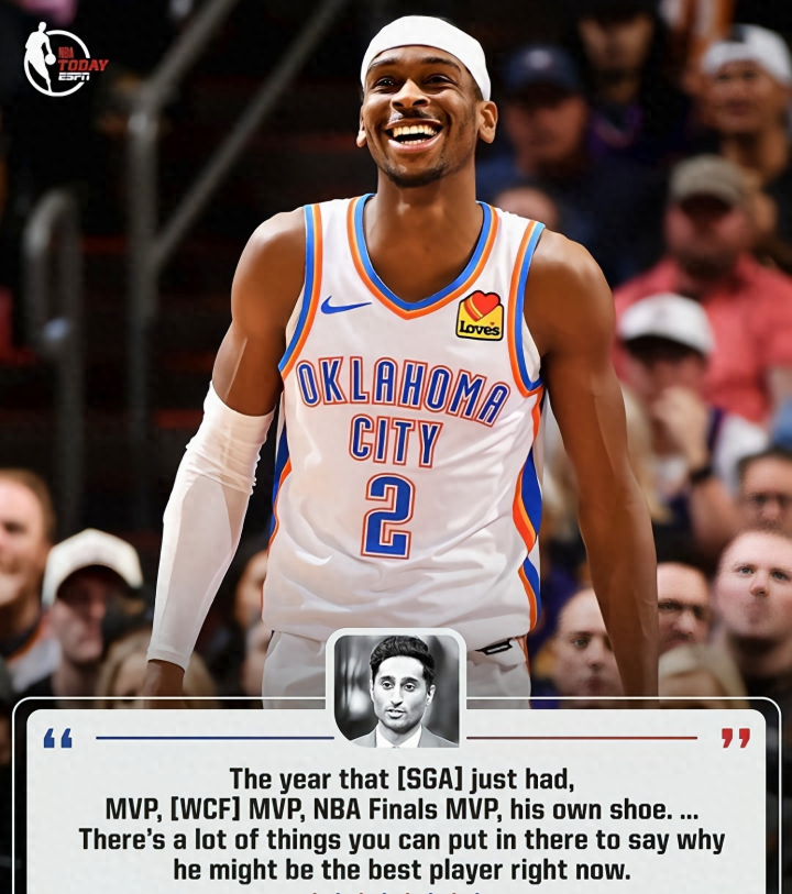 此前Shams曾发文称:一年集齐了总冠军、常规赛MVP、西决MVP、总决赛MVP,并且还推出了自己的签名鞋,这所有的事情放在一起,你可以认为亚历山大现在也许是联盟的最佳球员了。