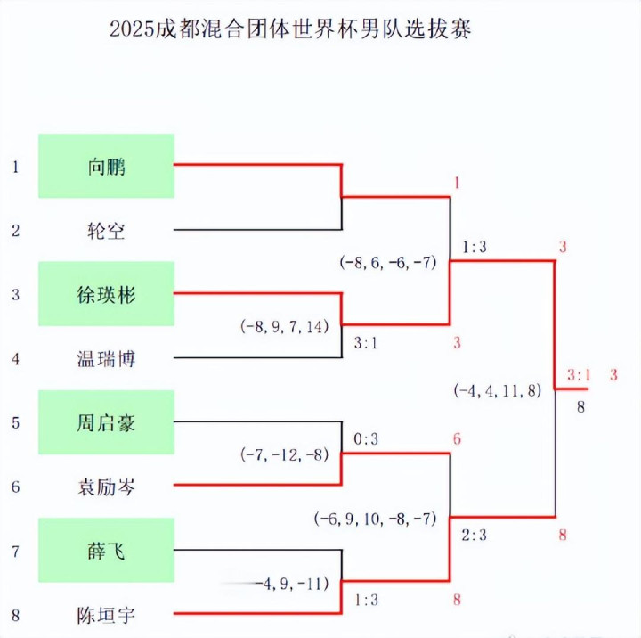 在这几人当中,世界排名最高的就是向鹏了,但最终突围的却并不是他,而是排名比温瑞博还要低的徐瑛彬,他以三个3:1的比分接连击败了温瑞博、向鹏和陈垣宇,最终拿到了名额,所以说,队员们的内战将会更加激烈。