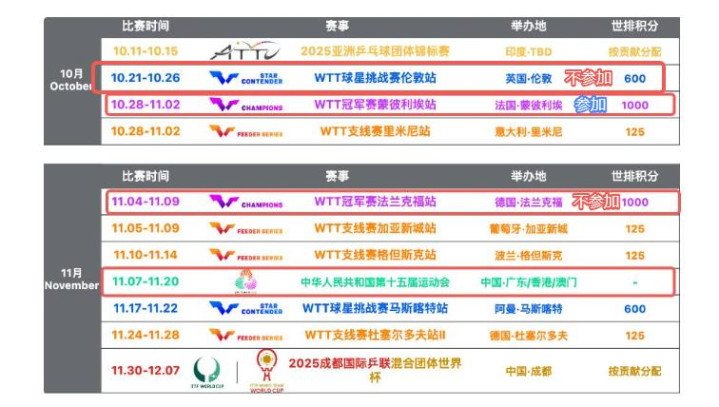 为了能够让国乒队员们有更多精力备战这项赛事,国乒主力们在接下来的WTT欧洲三连赛当中,只参加一站比赛,单打冠军获1000积分的比赛,国乒连名都没报。