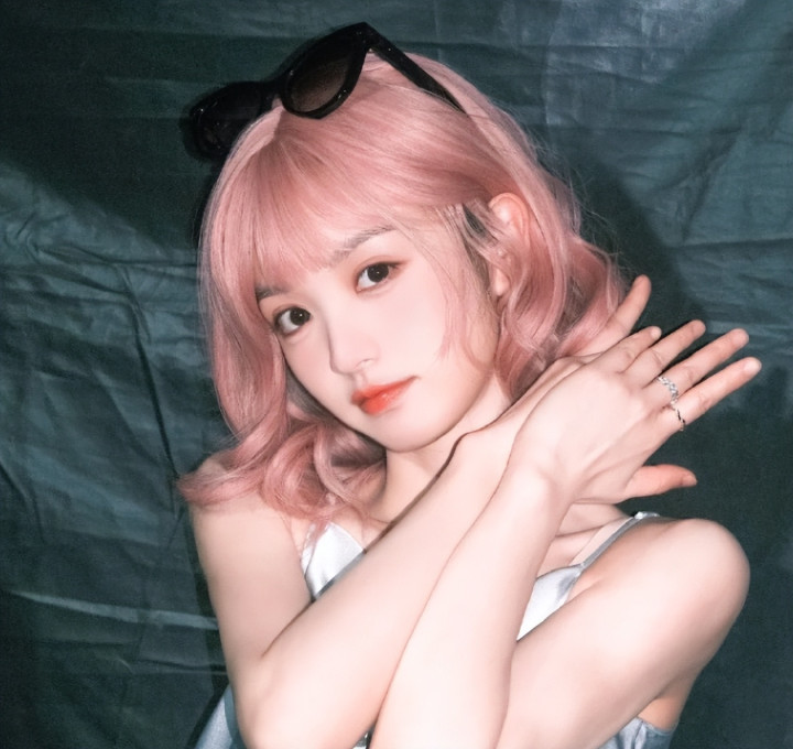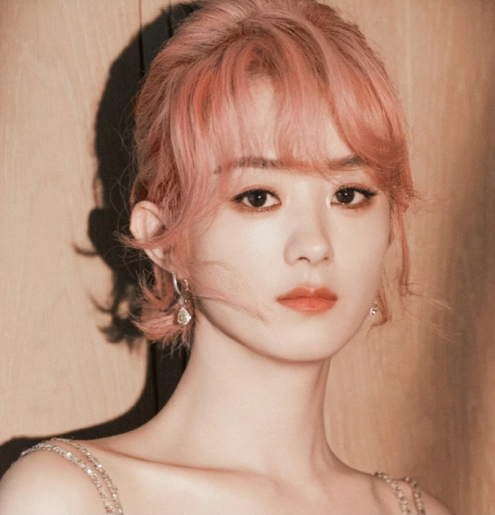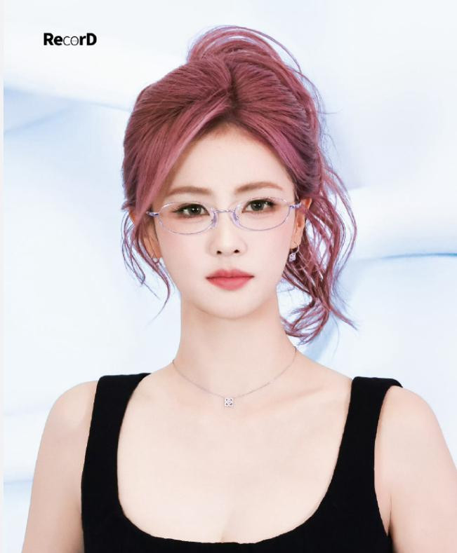 赵露思其实在之前的杂志大片中就尝试过粉发造型,不过粉色长发和齐刘海小黑裙的搭配属实有点难评,完全是靠姐姐的脸撑着。