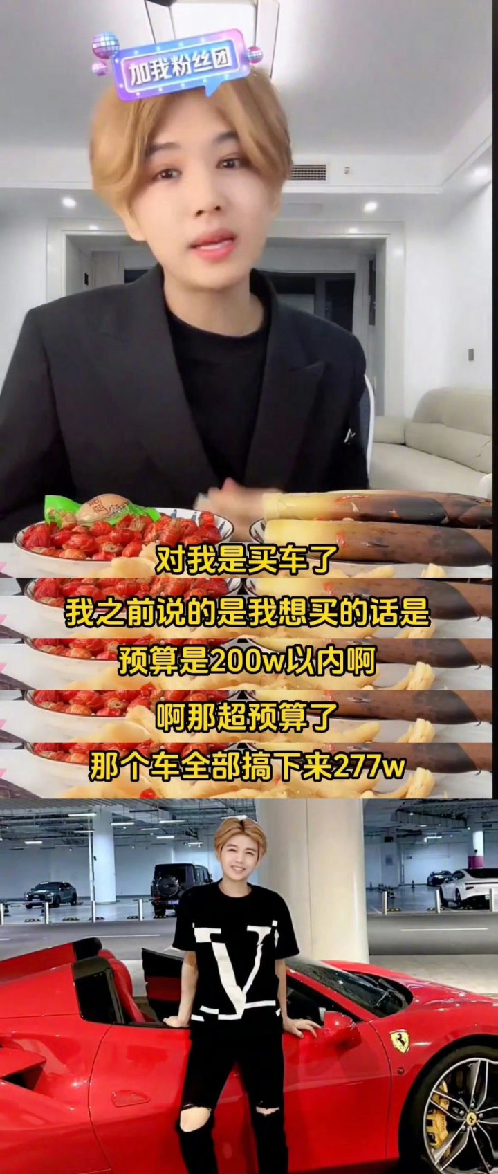 高调宣称购置1100万豪宅、277万法拉利及600万写字楼,巨额财富冲击感使其成为“草根暴富”的争议符号,进一步扩大知名度。