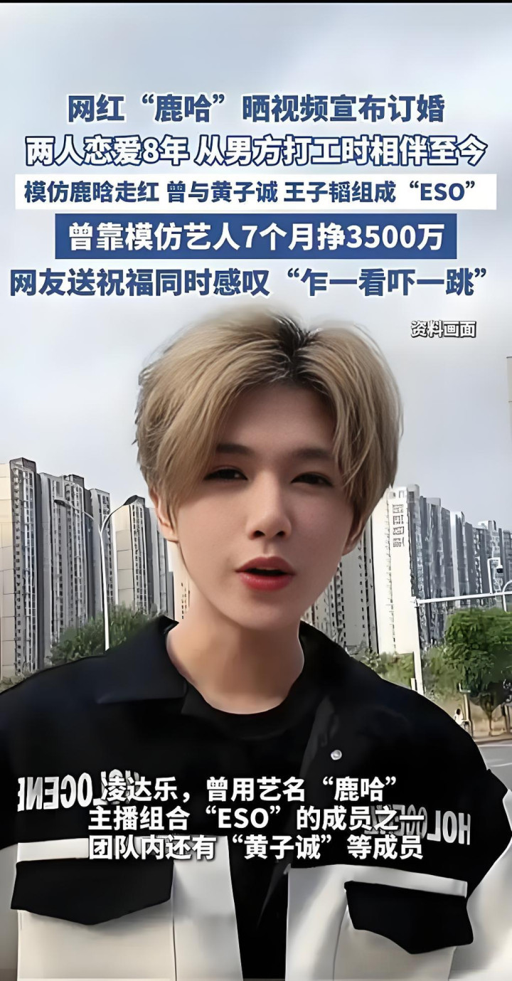 鹿哈原名凌达乐,2022年因模仿艺人鹿晗走红,曾加入山寨组合ESO。